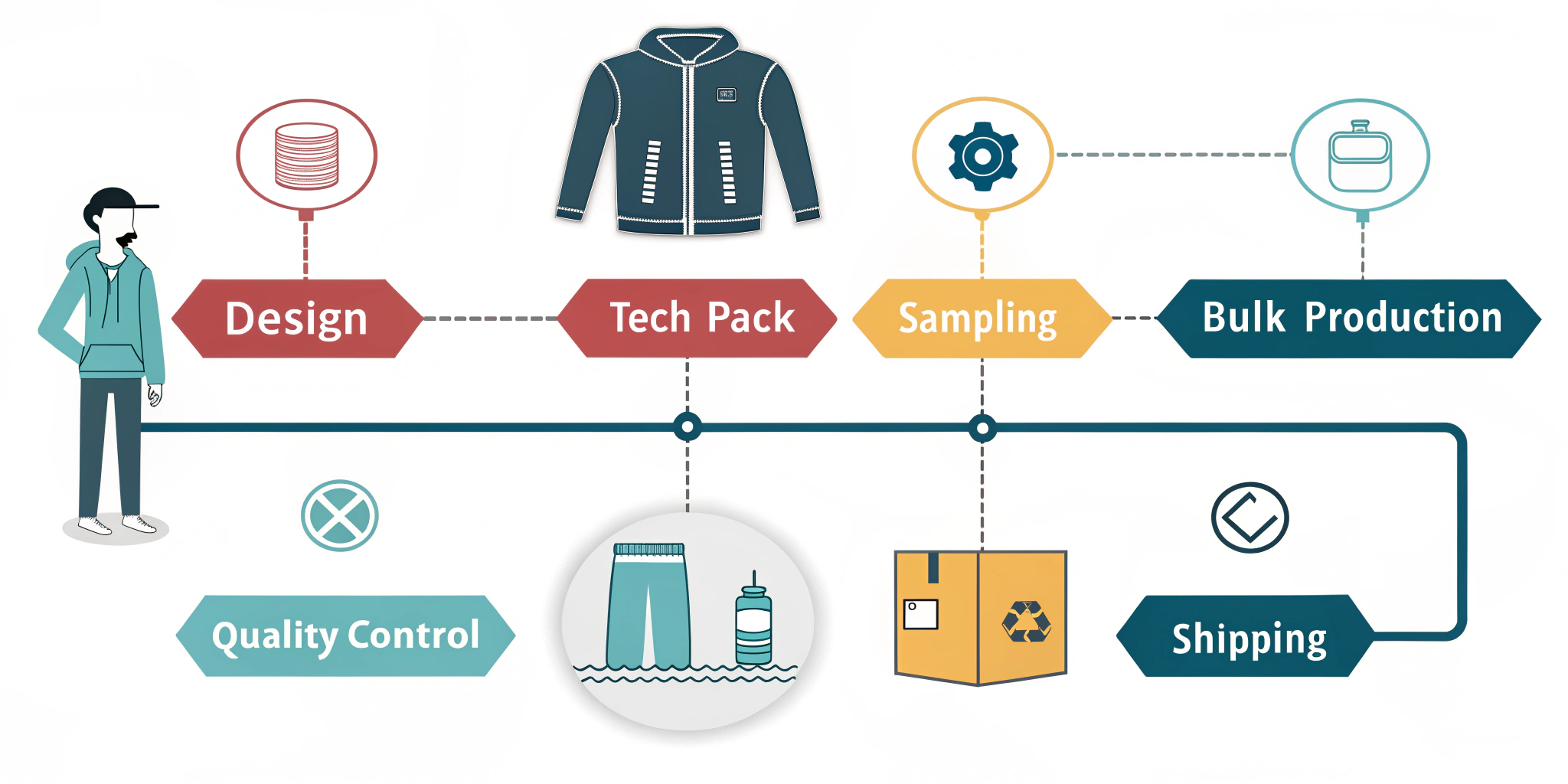 Brands provide tech packs, measurements, and design specifications. The factory produces according to these requirements.