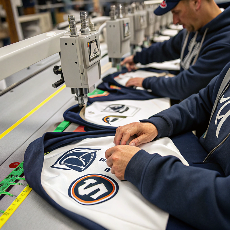 Advanced Production Equipment: Flatlock stitching, digital printing, embroidery, and heat transfer logo options.