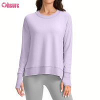 Custom Womens Light Weight Sweatshirts Manufacturer | Sweatshirt for Women Buttery Soft Yoga Tops Crewneck Cotton Spandex French Terry Oneck Shirts Side Slit Thumb Holes